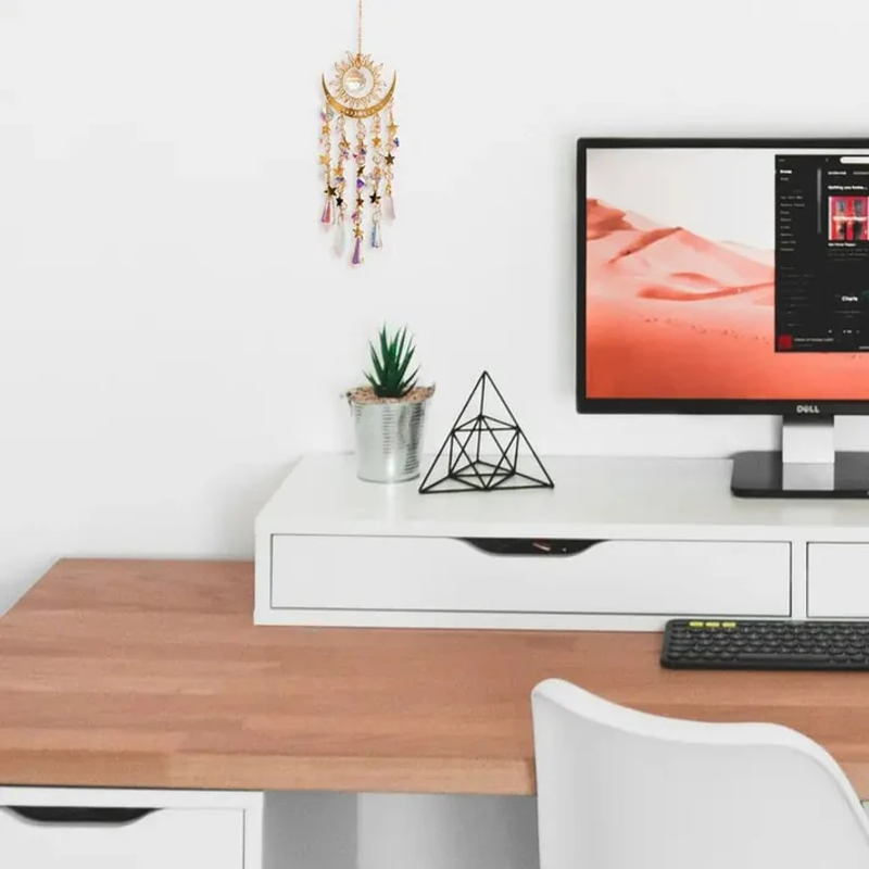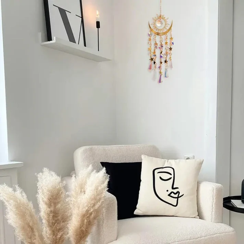 Suncatcher has a lustrous metal frame with sun, moonand stars patterns. Artificial crystals and pendants catchsunlight, creating a dreamy light - shadow effect. ltsunique design, fine craftsmanship and strongdecorativeness make it a captivating art piece.